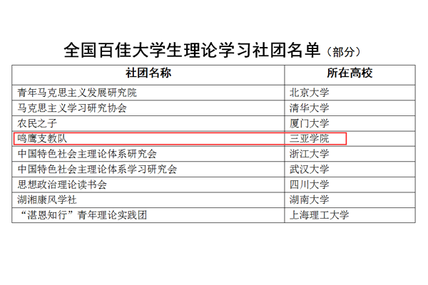 喜讯!在团中央面向全国高校开展的全国百佳大学生理论学习社团创建活动中,我校鸣鹰支教队荣获“全国百佳大学生理论学习社团”称号,作为全国唯一民办高校、海南省唯一高校,我校和北京大学、清华大学、浙江大学、厦门大学、武汉大学等全国一流大学同时获得此项荣誉。