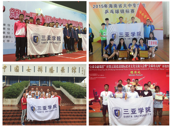 2015年,在各项全国体育竞技赛事中我校成绩显著。2015年第七届全国水中健身操比赛中,我校摘得双人划手掌操组冠军,还荣获最佳领操员奖、最佳编排奖和体育道德风尚奖;在首届中国大学生帆船锦标赛中获得乙组第五名的好成绩;在2015“全球金融集团”杯第五届北京国际武术文化交流大会暨“全球功夫网”杯第四届北京国际功夫交流大会中荣获4枚金牌;参加2015年海南省大中专学生羽毛球锦标赛,获混双第一名;获2015年海南省大中专学生乒乓球锦标赛女团第一名、女单第一名;在2015年海南省大众跆拳道锦标赛中共获得12金13银9铜;2015中国・三亚城市帆板邀请赛业余组中,学校代表队还获得了第二名等好成绩。