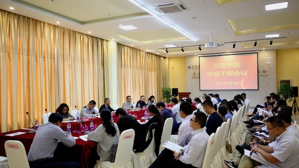 3月3日,我校于白鹭苑东湖厅召开新学期中层干部会议,会议讨论了《三亚学院办学大纲》、《大学文化解析》、《进取者行动指南》及春学期工作计划。党委书记、校长陆丹勉励全校干部应坚守大学本位,立足教育本身,将“管理即服务”化解、聚焦到“以学生为中心”的全员、全过程、全环节中,高品质履职、大胆创新,持续提高师生满意度。党委副书记、学务长沈建勇,副校长刘晓鹰,副校长、人事长车怡,党委委员、工会主席贾朋社,校长助理隋姗姗出席会议。