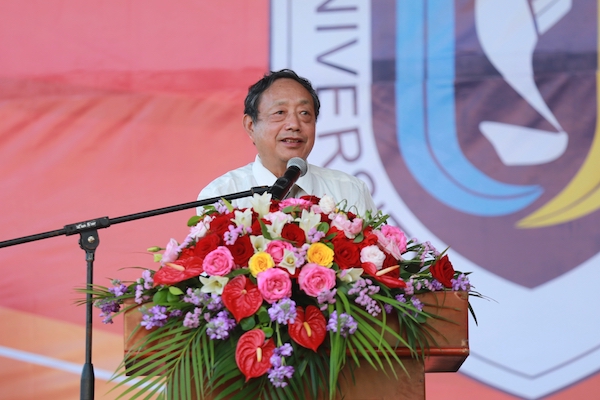 中国科学院院士、三亚学院院士工作站进站院士翟明国应邀参加开学典礼,热烈祝贺2017级新同学高考题名,在三亚学院开启人生新的起始点和新生活。他表示,三亚学院充满活力,生机盎然,有特色、有前途,望新同学要珍惜大学教育的机会和现有的教育条件,不懈努力,不断奋斗,努力培养道德和科学素养。他还结合个人经历与大家分享学习体会,鼓励学生要扎根热土、立志成才、报效祖国,成为对国家和社会有用的人。