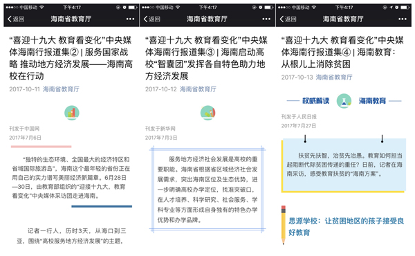 这些新闻还被搜狐网、网易网、凤凰资讯、人民网等国内影响力网络媒体平台广泛转载报道,海南省教育厅的微信公众号上也连续推送《“喜迎十九大 教育看变化”中央媒体海南行报道集》系列文章,多次提及我校以大学力量不断助推海南国际旅游岛建设,为区域经济社会发展建设提供人才支持和智力支撑。