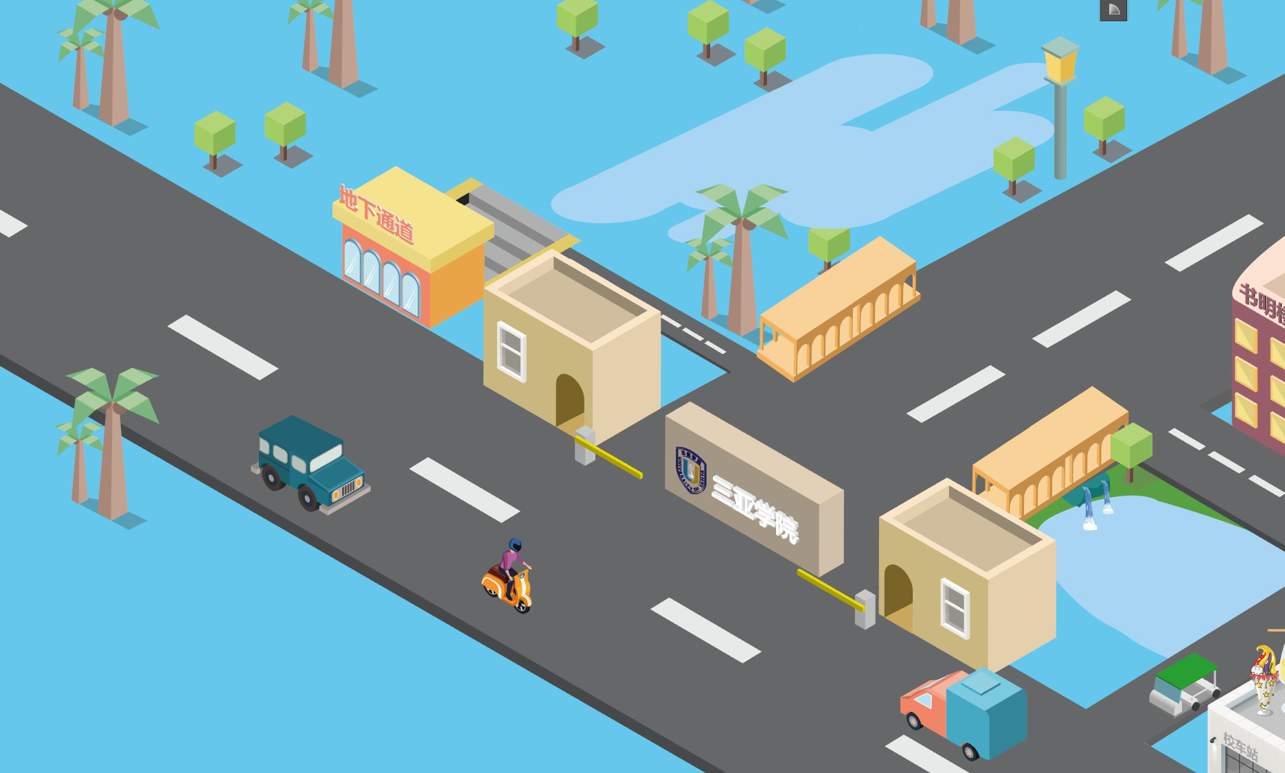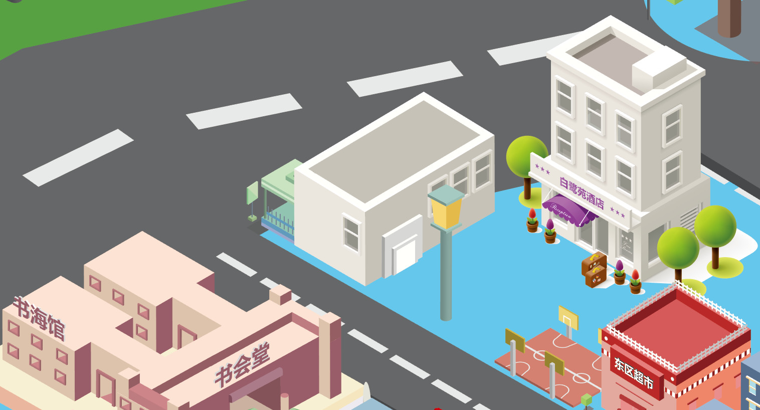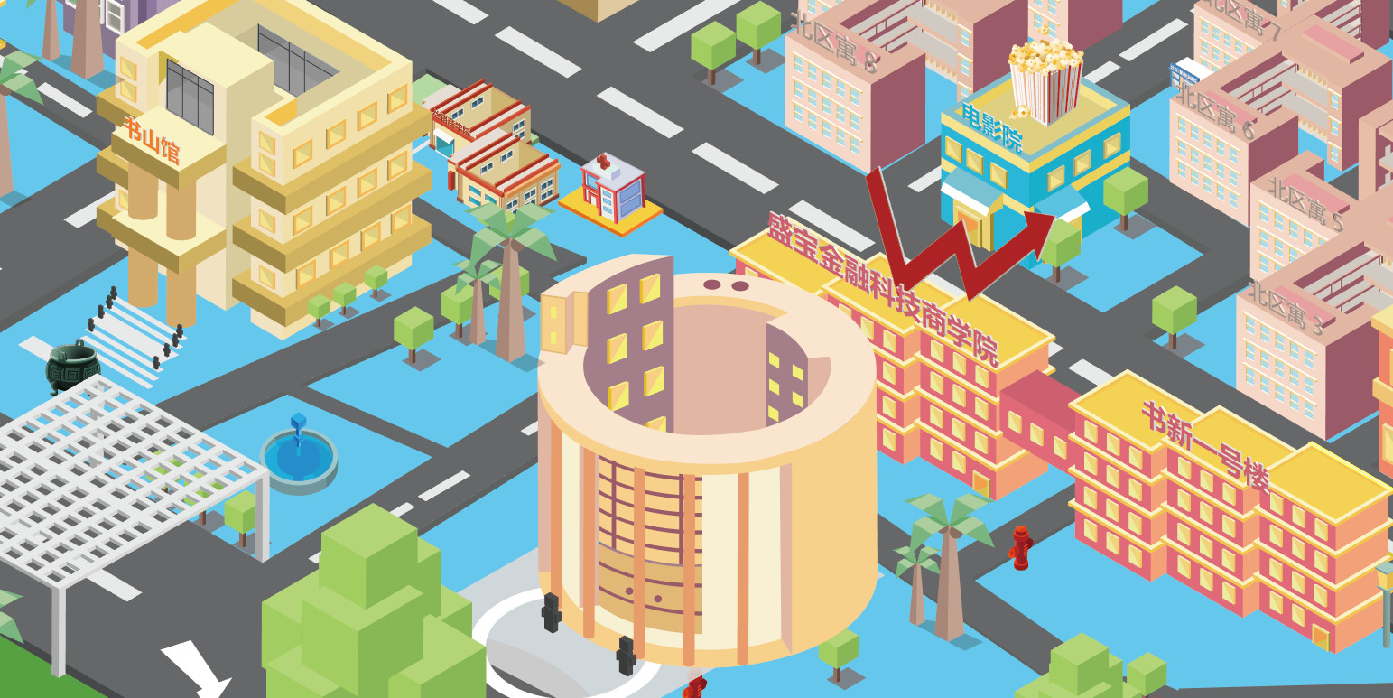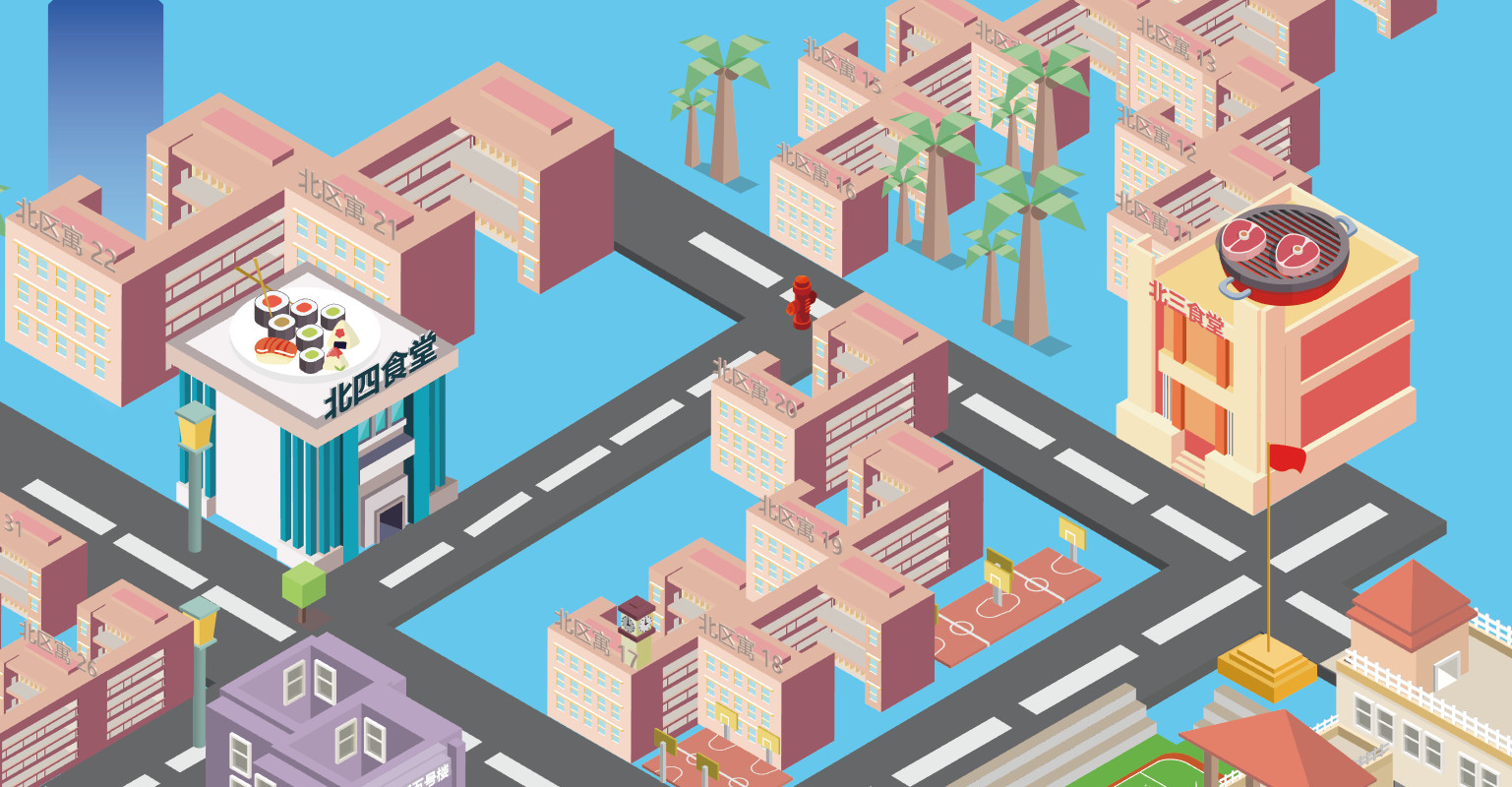 新版地图灵感来源于平面化的游戏和艺术设计画,全程以流行的AI的2.5D风格作为基础进行修改加工。制作前期对学校进行了第二次全面勘察拍照,以掌握并进一步简化建筑结构,最终总结规划出了这样一版偏卡通的建筑风格。