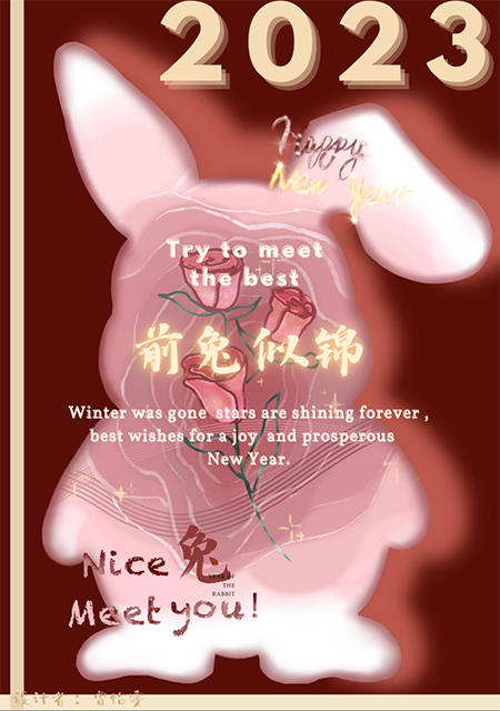 动画2101曾怡雯:新的一年,希望所有俗套的祝福都能在你身上灵验,祝你在新的一年所到之处都会有好事发生,愿你新的一年前兔似锦。2023 兔年大吉,平安喜乐,祝你被快乐环绕,每一口都全糖去冰,新的一年希望你能如愿以偿,祝你元气Power,2023大展宏兔,祝你在新的一年里充实快乐Everyday,祝你健康和学业都拿捏的稳稳的,兔个吉利,祝你在新的一年里有趣有盼无灾无难。新年快乐!Happy New Year!