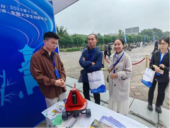 我校入选参展的项目实物模型“第三代无人消杀车”在展区内,吸引了众多参展观众驻足观看,参观人员络绎不绝,交流氛围热烈。项目从背景、设备原理、技术优势到运作方式及应用前景都给观展者留下了深刻印象。
