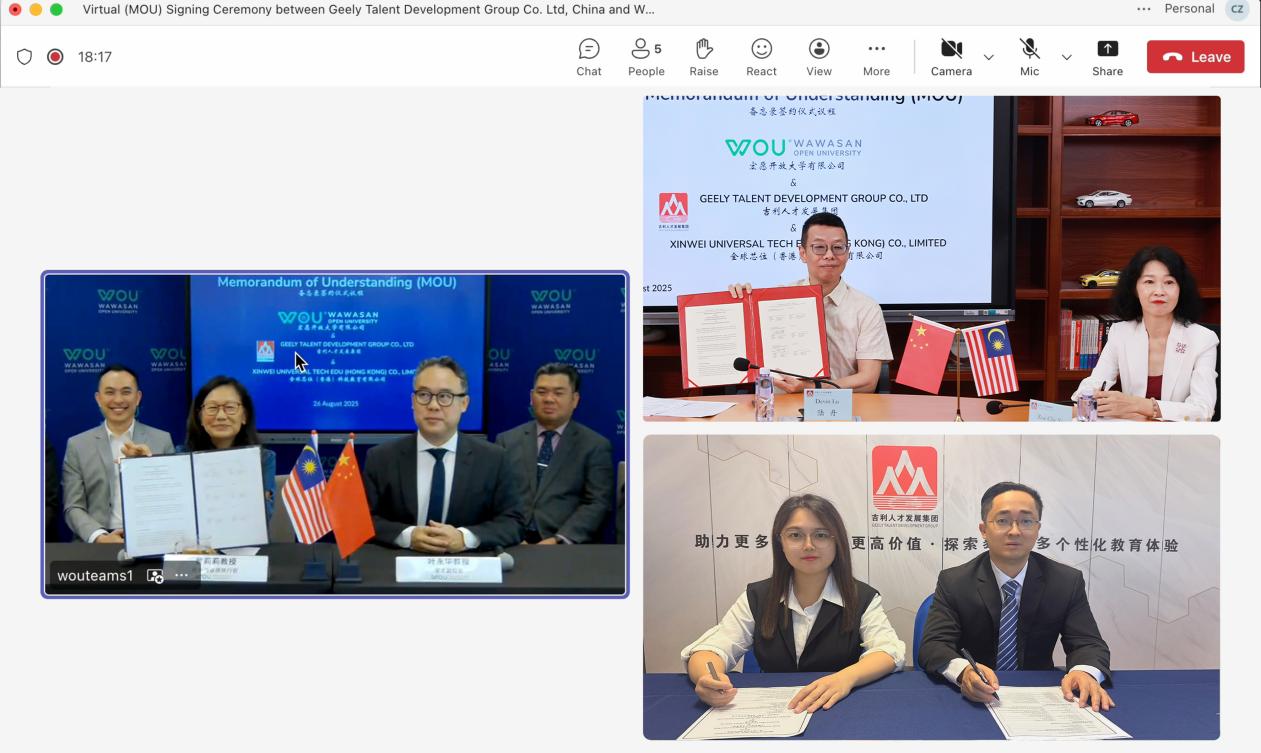 2025年8月26日,吉利人才发展集团、全球芯位(香港)科技教育有限公司与马来西亚宏愿开放大学正式签署合作备忘录(MOU),标志着三方在教育领域的战略合作全面启动。此次合作旨在整合各方资源,共同推动高等教育国际化进程,尤其是在硕士及博士课程开发、双学位项目以及线上教育平台建设等方面开展深度合作。早在今年7月,全球芯位与宏愿开放大学已就本次签署的合作备忘录(MOU)进行过深入交流。