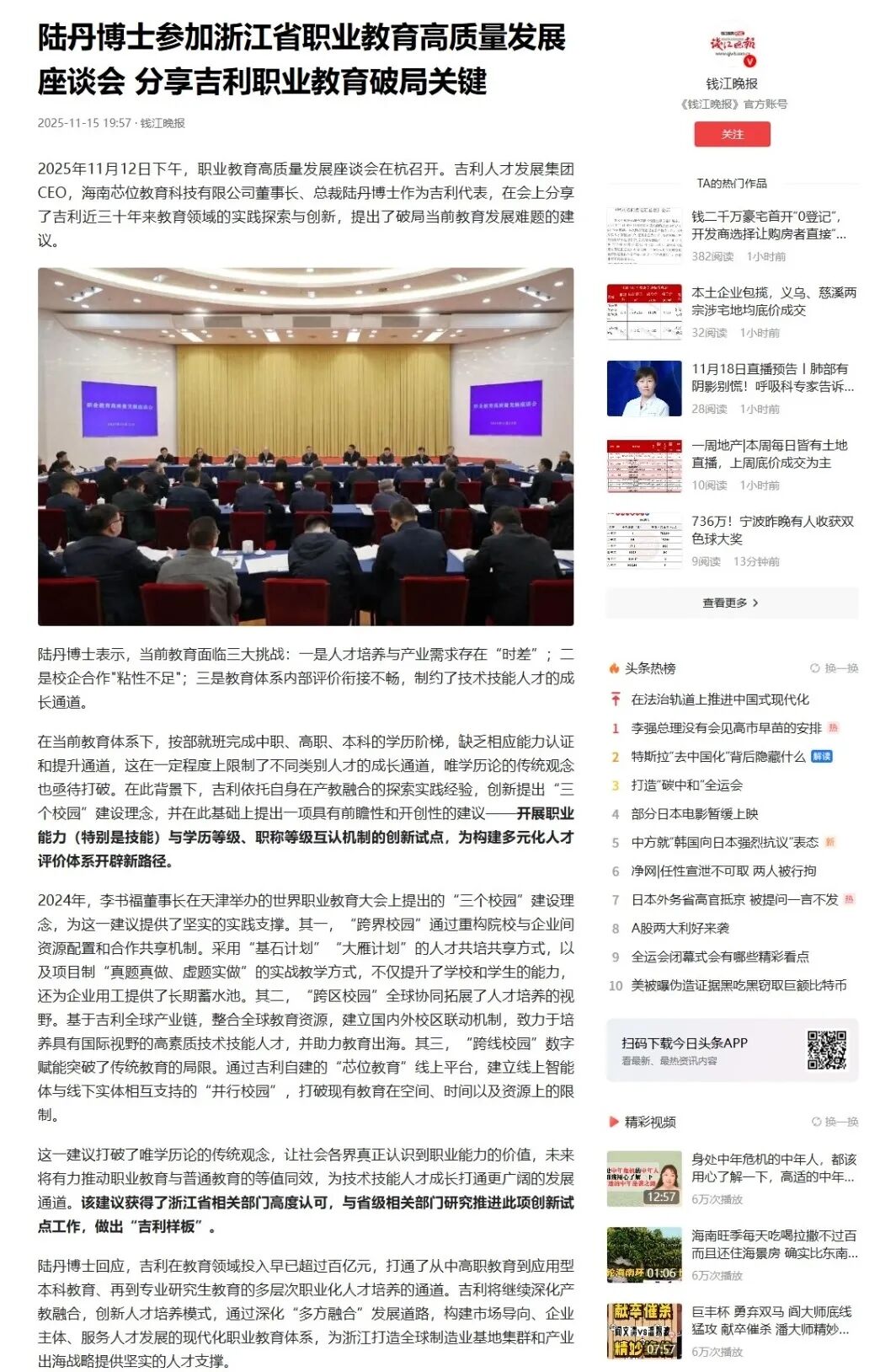 摘要:2025年11月12日,浙江省职业教育高质量发展座谈会在杭州顺利召开。会议聚焦深化职普融通、产教融合、科教融汇,着力加快构建具有浙江特色的现代职业教育体系,为高质量发展建设共同富裕示范区筑牢人才根基。吉利人才发展集团CEO、海南芯位教育科技有限公司董事长、总裁陆丹博士受邀参会,会上分享的职业教育实践经验与破局建议,获得了浙江省相关部门高度认可。