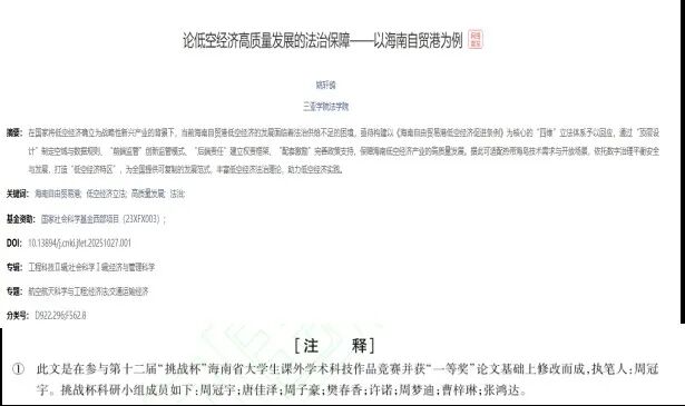 在竞赛成果基础上,团队进一步深化研究,在《财经理论研究》期刊上发表了《论低空经济高质量发展的法治保障——以海南自贸港为例》学术论文。文章系统探讨了低空经济政策与法律体系的协调路径,提出了构建“有限赋权”低空空域监管制度、建立权益保障机制等创新建议,为海南自贸港低空经济立法提供了理论支撑。