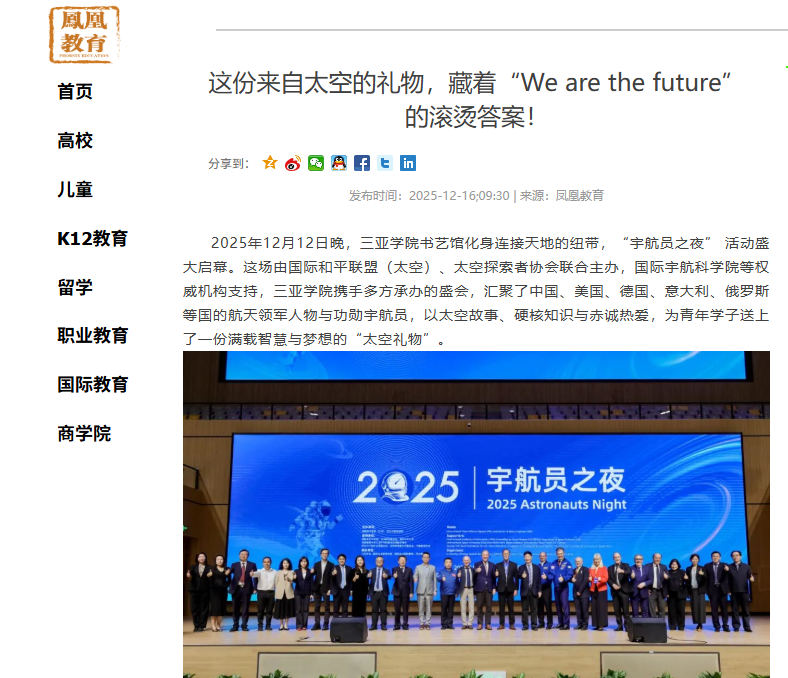 2025年12月12日晚,三亚学院书艺馆化身连接天地的纽带,“宇航员之夜” 活动盛大启幕。这场由国际和平联盟(太空)、太空探索者协会联合主办,国际宇航科学院等权威机构支持,三亚学院携手多方承办的盛会,汇聚了中国、美国、德国、意大利、俄罗斯等国的航天领军人物与功勋宇航员,以太空故事、硬核知识与赤诚热爱,为青年学子送上了一份满载智慧与梦想的“太空礼物”。