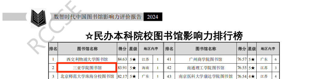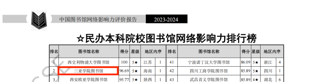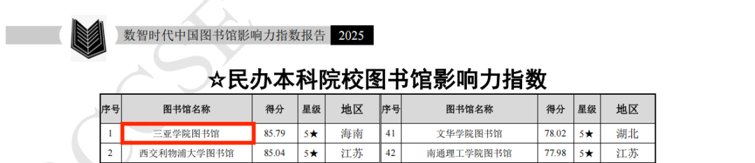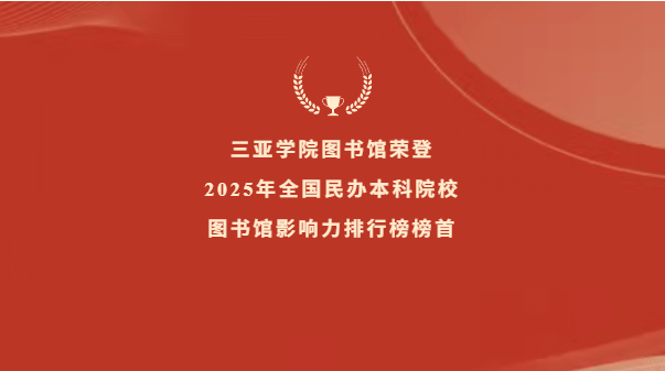 日前,由武汉大学中国科学评价研究中心、数字出版智能服务技术教育部工程研究中心联合研究制作的《数智时代中国图书馆影响力指数报告(2025版)》正式发布。在本次评估中,三亚学院图书馆表现卓越,荣获全国民办本科院校图书馆影响力指数排行榜第一名,并连续三年获评五星级图书馆(5★为具有突出影响力的单位,即排在最前面10%的单位)。