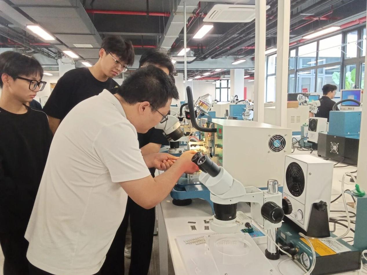 “以前觉得芯片封装离自己很远,现在我们可以亲手完成从晶圆划片到测试的全流程,真正理解了工艺背后的原理和质量控制的意义。”一名参与项目的学生感慨道。现在,学生们亲手划片、键合、测试,把“黑箱”拆成了看得见、摸得着的工艺流程,但更不一样的是上课方式,课程不再让学生“按部就班”做验证实验,而是直接把企业的真实项目搬进课堂。学生以“产线工程师”“工艺技术员”的身份,分组接单、分工协作:有人优化PCB设计、制定钢网开孔方案,有人编写贴片程序、调试炉温曲线,最后一起完成车规级可靠性测试。在封装实验室,从晶圆划片到最终测试,每一步都得自己动手、自己负责。