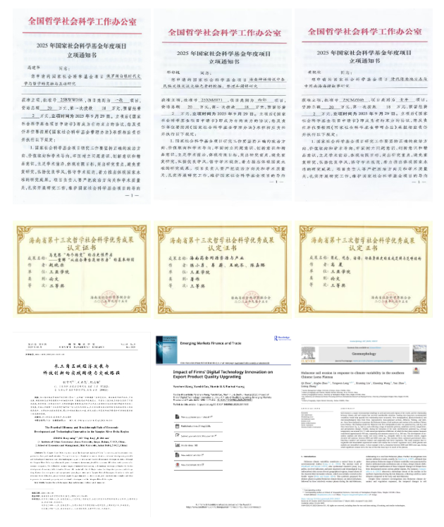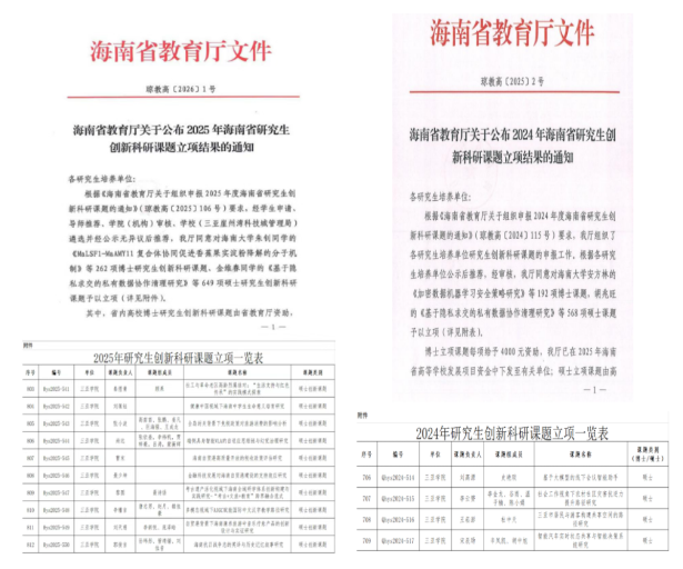 2025年,学校研究生导师团队共获批省部级以上项目22项,其中,国家社科基金项目5项,省部级及其他纵向课题17项;在《GEOMORPHOLOGY》《科学管理研究》等SCI、SSCI、CSSCI等来源期刊发表高水平论文118篇,取得专利30项,获省部级及以上各类科研奖励15项。以高水平科研成果为牵引,导师团队在服务国家战略和海南自贸港建设中勇担使命,为研究生培养提供了坚实的科研支撑。