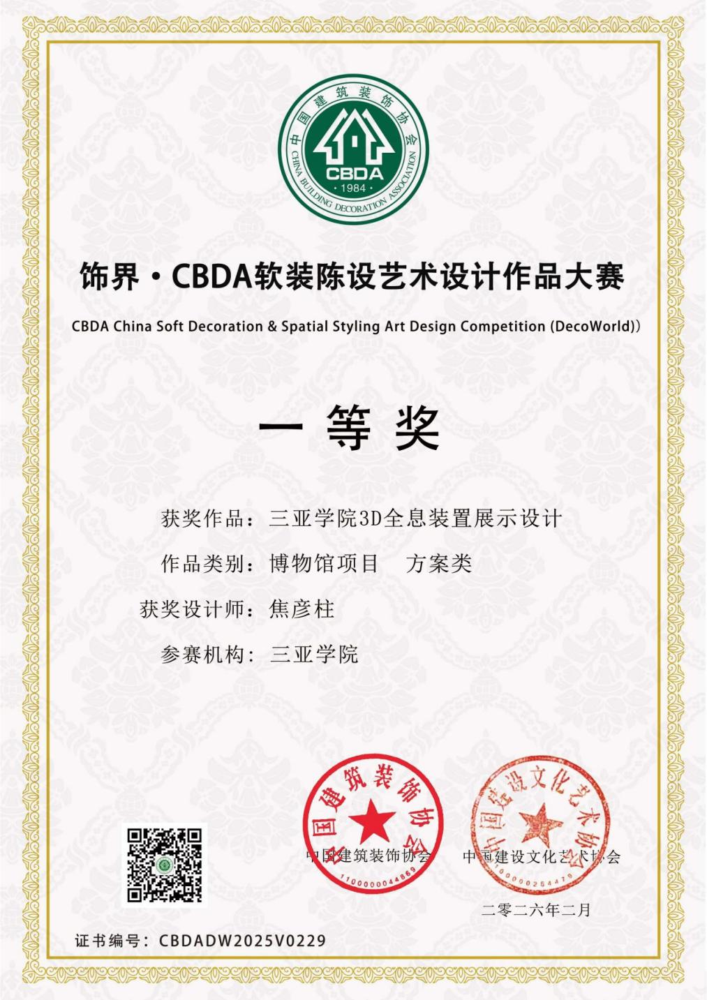 近日,2026年度饰界・CBDA 软装陈设艺术设计作品大赛评选结果公布,三亚学院艺术创意与数字设计学院焦彦柱老师凭借三亚学院3D全息装置展示设计,荣获博物馆项目方案类一等奖。