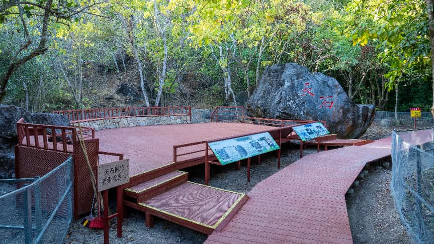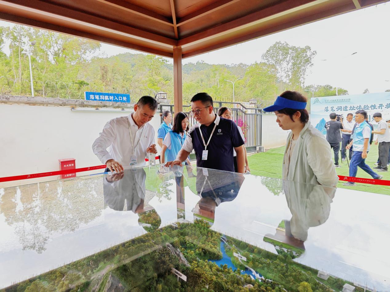 在多维设计层面,团队围绕“让文化遗产活起来”的目标,完成了研学场景的全维度落地:打造1:300比例室外沙盘区,复刻遗址地貌与规划格局;建设“万年洞藏 南海曙光”临时展厅,设文化溯源、四洞印记等四大板块,搭配互动抽拉板、科普滚轮墙等趣味环节;打造400米“时空织迹”文化太阳能灯箱景观带,以八组主题灯箱串联遗址形成、考古发现等核心内容;设计水滴广场与天石广场两大体验区,将仙郎仙娘传说融入景观,设置研学互动环节;最终带领参与者走进落笔洞核心区,近距离观摩元代“落笔洞”题刻、宋至清摩崖诗句,触摸地质“时光年轮”,在真实遗址场景中感受万年历史。