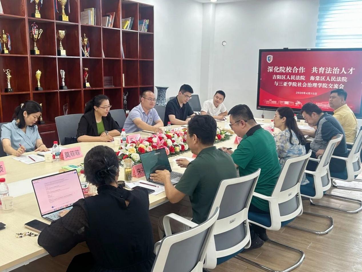4月15日,三亚市吉阳区人民法院、海棠区人民法院与社会治理学院开展合作交流,三方围绕法治人才培养达成全方位协同育人共识,共同探索校地融合育人新模式。
