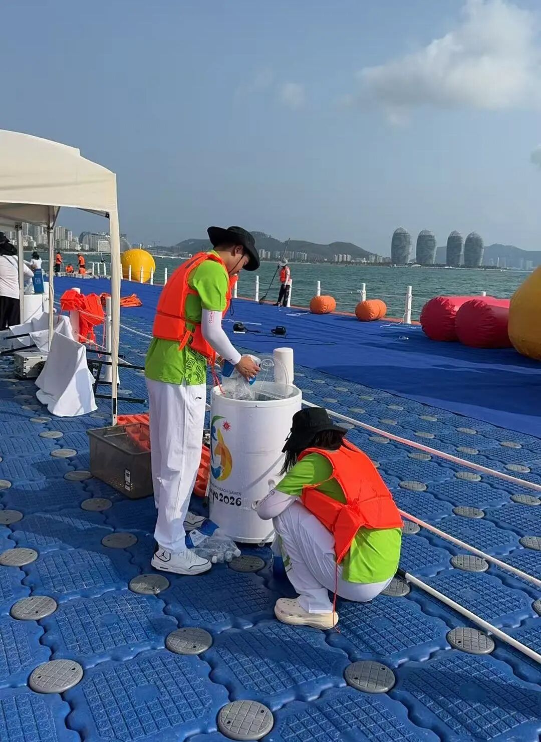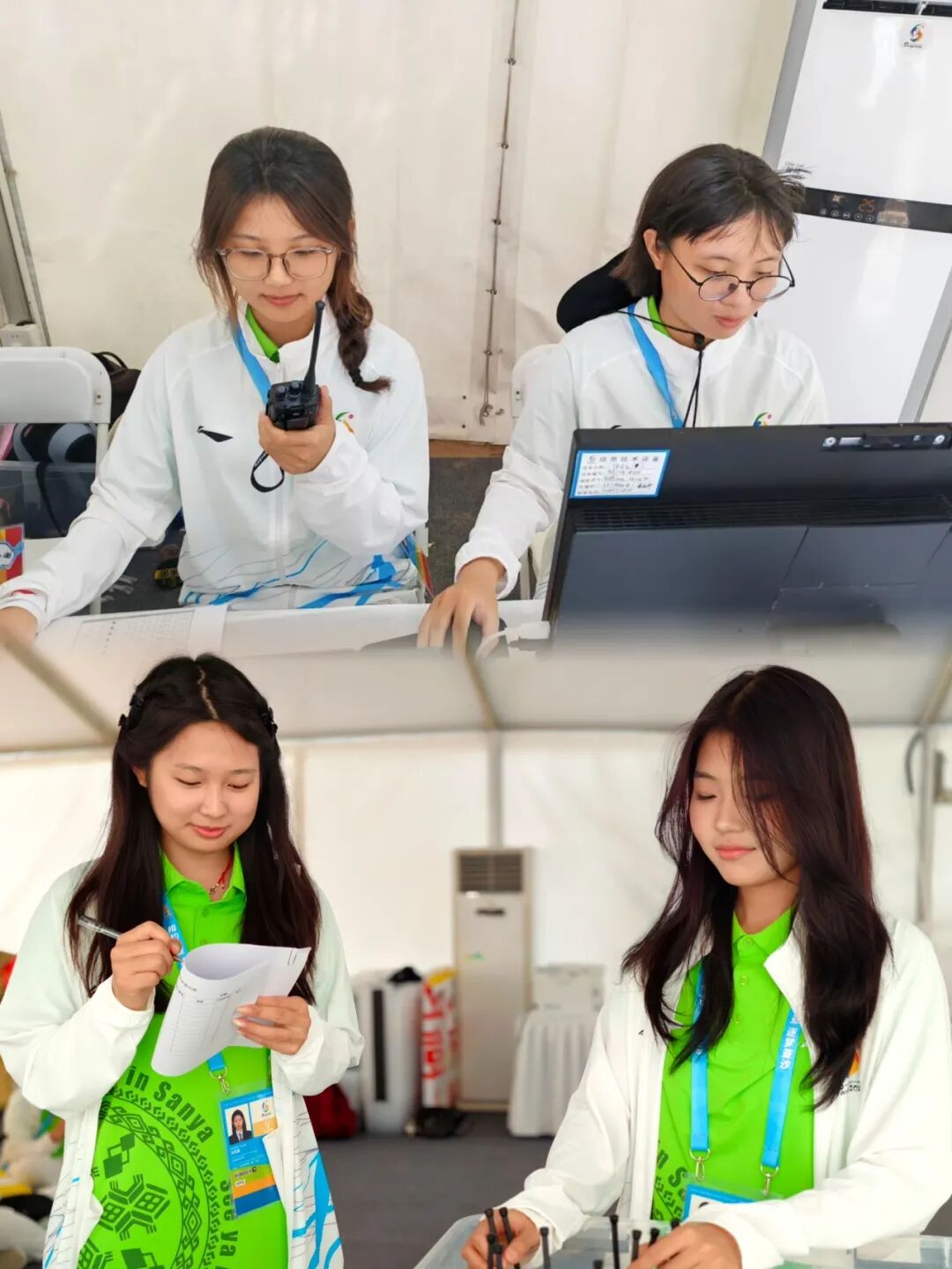身穿“亚沙绿”的志愿者和工作人员