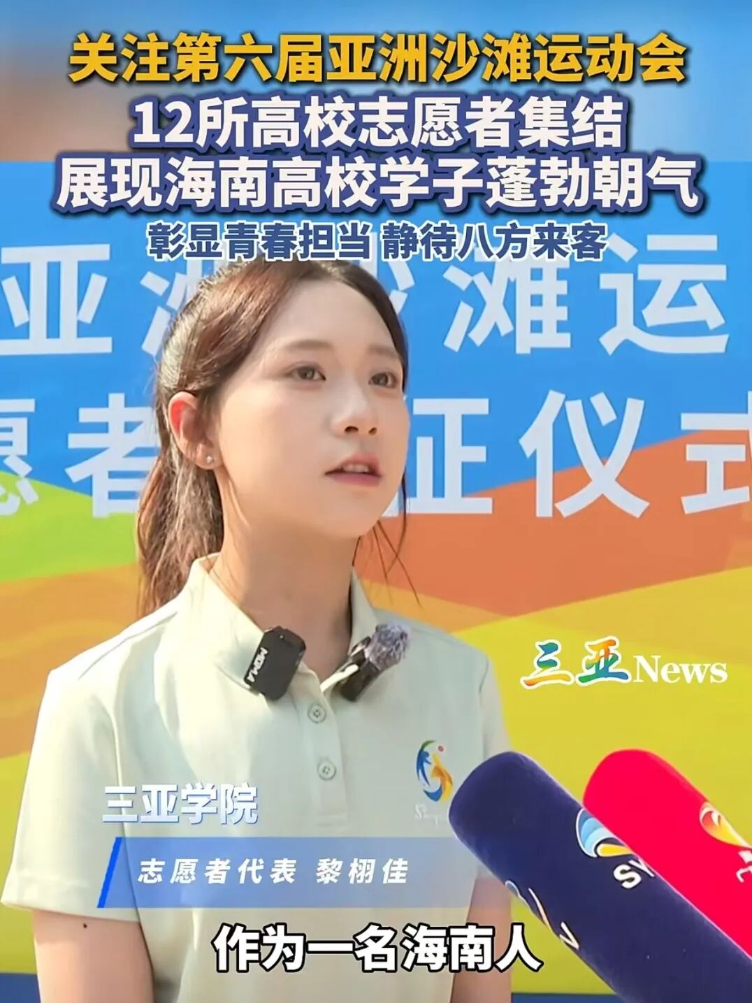 在亚沙会志愿者出征仪式上,黎栩佳作为代表登台领誓:“百日冲刺,奋战亚沙;椰风海韵,同心共筑;使命必达,决胜天涯!”这位土生土长的三亚姑娘,经过系统培训,服务于海月广场的卡巴迪和水球比赛。从课堂到国际赛事前线,她身上烙印着“产教融合、勇于实践”的时代担当。“我用行动展现海南人民的热情。”她的誓言,正是无数“小鹿鹿”志愿者的心声,以青春热血为海南自贸港国际化建设添砖加瓦。