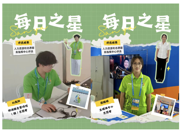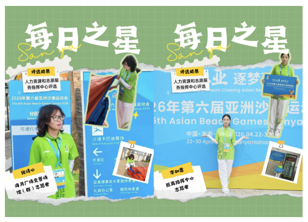 在亚沙会四大核心点位——主媒体中心、海月广场、御海路、抵离,三亚学院志愿者以专业与坚守赢得广泛认可。累计269人次获评“每日之星”,这是对这群“亚沙绿”在平凡岗位上默默奉献的最好见证。每一颗“每日之星”,都是三亚学院学子用青春书写责任、用行动诠释担当的闪亮缩影。