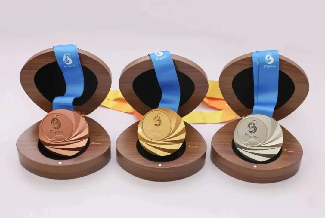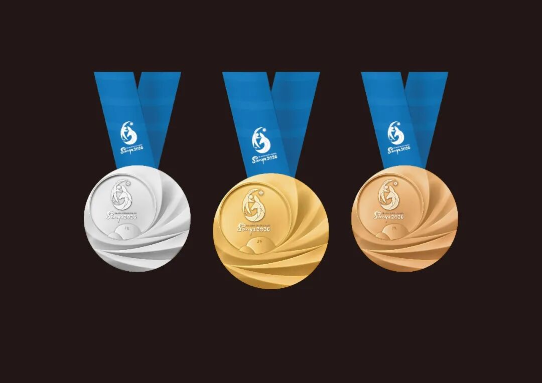 奖牌“天涯之时”设计创意源自“海上生明月,天涯共此时”,正面融入会徽与“天涯石”,下半部以弧线模拟海浪沙滩,背面与侧面刻有亚奥理事会会徽及“Welcome to Sanya”,配套贝壳形奖牌盒尽显滨海风韵。