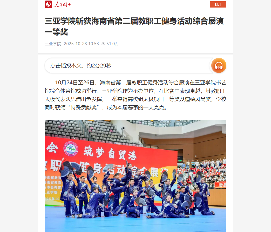 人民网报道三亚学院斩获海南省第二届教职工健身活动综合展演一等奖