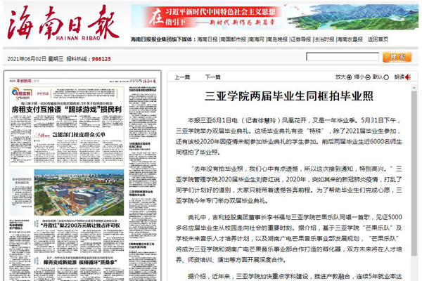 《海南日报》报道三亚学院两届毕业生同框拍摄毕业照