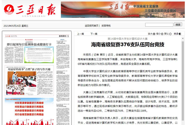 《三亚日报》报道第14届中国大学生计算机设计大赛在三亚学院举行