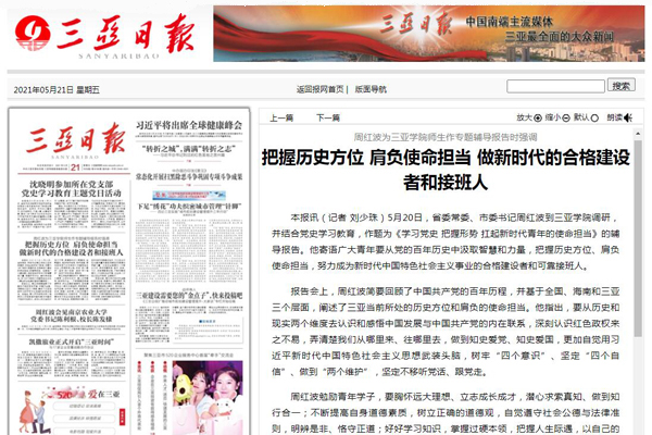 《三亚日报》头版报道周红波为三亚学院师生作专题辅导报告