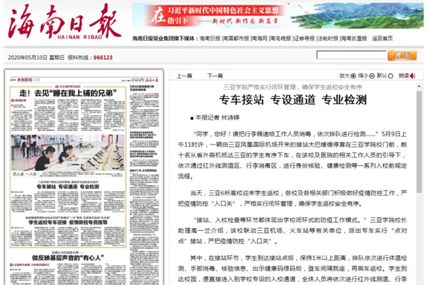 《海南日报》报道三亚学院严格实行闭环管理,确保学生返校安全有序