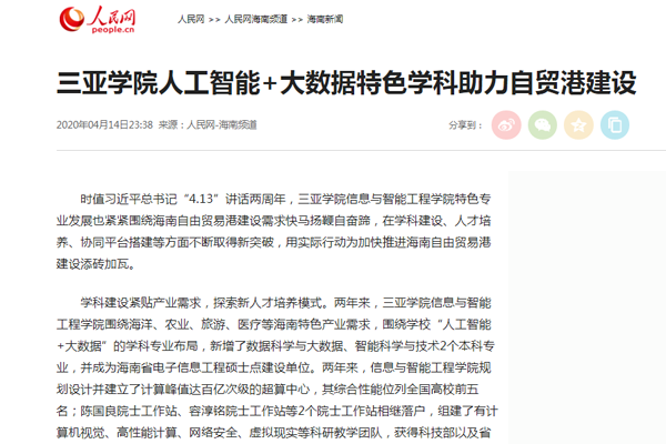 人民网报道三亚学院人工智能+大数据特色学科助力自贸港建设