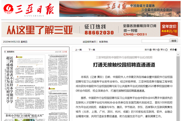 《三亚日报》报道三亚学院获批中国软件行业校园招聘平台试点院校