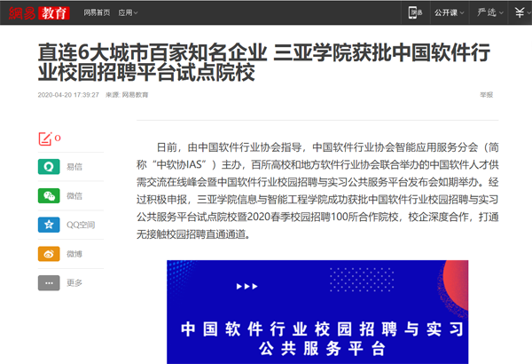 网易教育报道三亚学院获批中国软件行业校园招聘平台试点院校