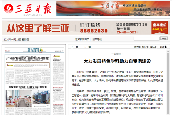 《三亚日报》报道三亚学院大力发展特色学科助力自贸港建设