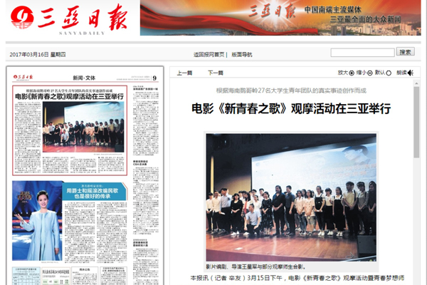 《三亚日报》报道电影《新青春之歌》观摩活动在我校举行