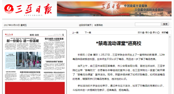 《三亚日报》报道“禁毒流动课堂”走进我校