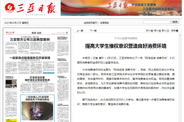 《三亚日报》报道我校开展315普法宣传 提高学生网购维权意识