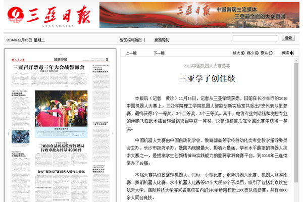 《三亚日报》报道我校学子在2016中国机器人大赛中荣获佳绩