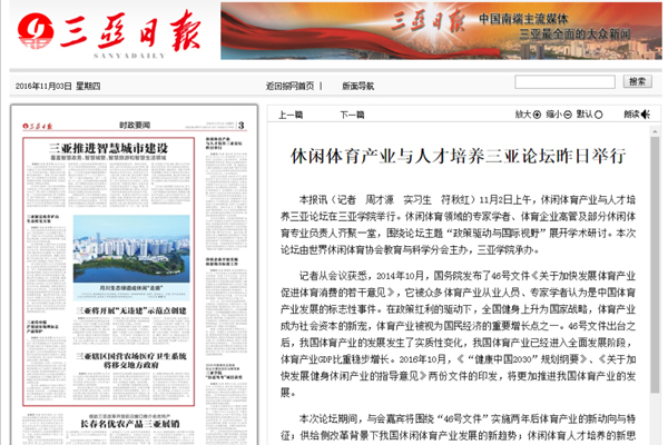 《三亚日报》报道休闲体育产业与人才培养三亚论坛在我校举行