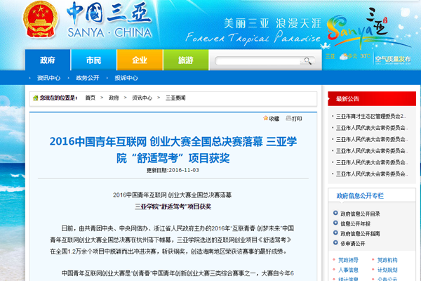 三亚市人民政府网报道我校“舒适驾考”项目在2016中国青年互联网创业大赛中获奖