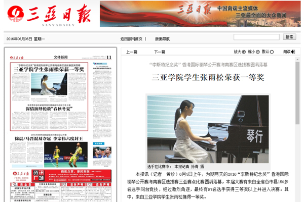 《三亚日报》报道我校学生张雨松荣获香港国际钢琴公开赛海南赛区一等奖