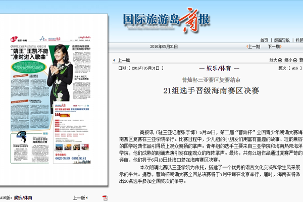 《国际旅游岛商报》报道在我校举行的“曹灿杯”全国青少年朗诵大赛复赛结束