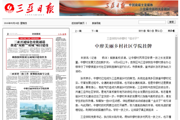 《三亚日报》报道我校与中廖村合作 中廖美丽乡村社区学院挂牌