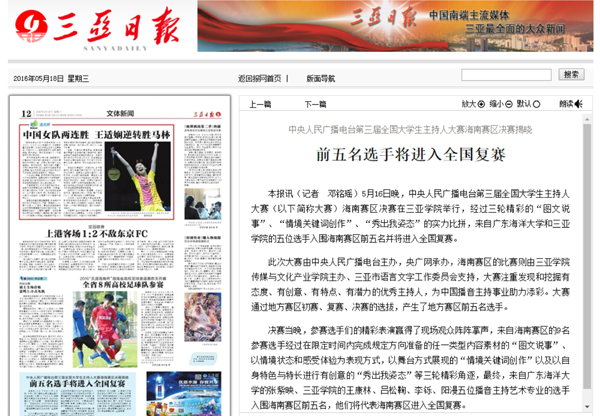 《三亚日报》报道第三届全国大学生主持人大赛海南赛区决赛在我校举行