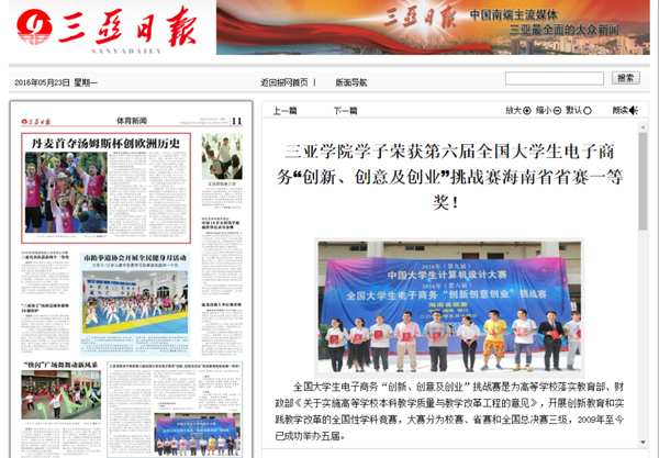 《三亚日报》报道我校学子荣获第六届全国大学生电子商务“创新、创意及创业”挑战赛海南省省赛一等奖!