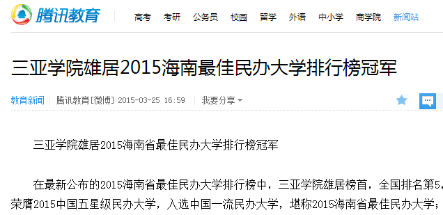 腾讯网三亚学院雄居2015海南最佳民办大学排行榜冠军