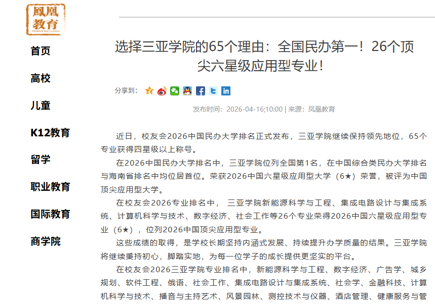 凤凰教育报道选择三亚学院的65个理由:全国民办第一!26个顶尖六星级应用型专业!