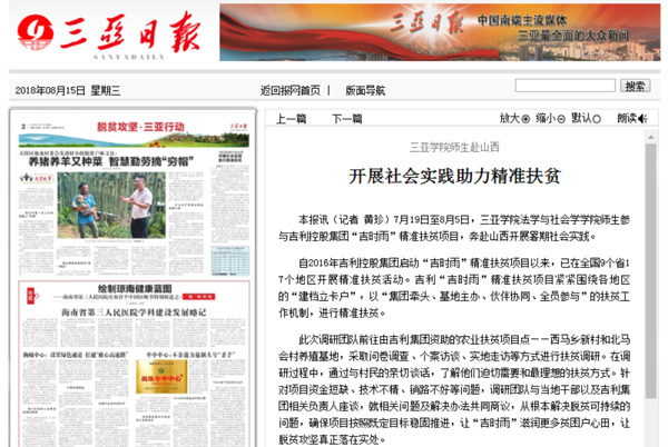 《三亚日报》报道我校师生赴山西开展社会实践助力精准扶贫