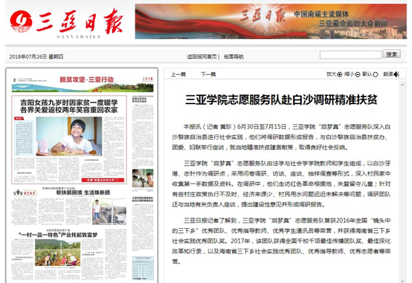 《三亚日报》报道我校志愿服务队赴白沙调研精准扶贫