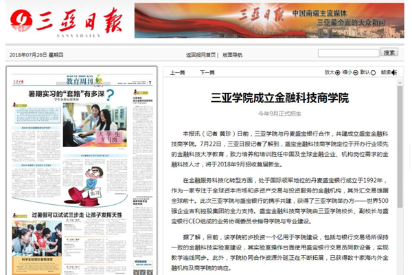 《三亚日报》报道我校成立金融科技商学院 今年9月正式招生