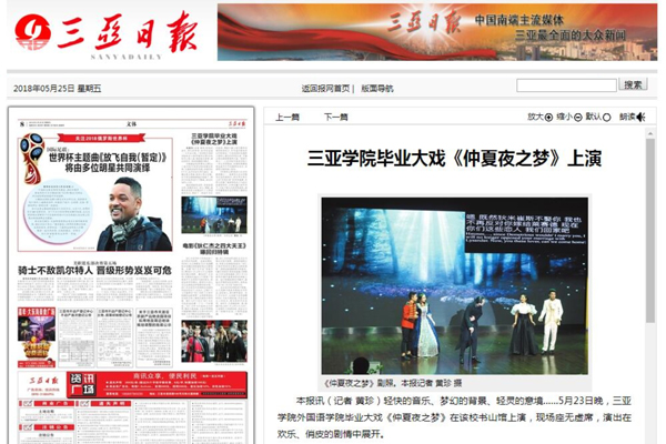 《三亚日报》报道我校上演毕业大戏《仲夏夜之梦》