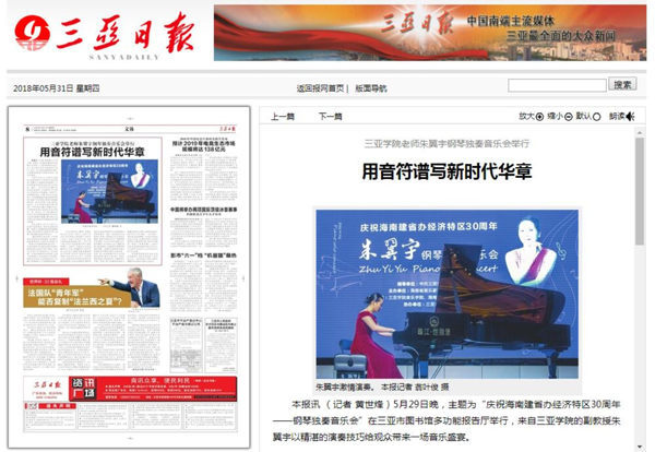 《三亚日报》报道我校朱翼宇老师钢琴独奏音乐会举行 用音符谱写新时代华章